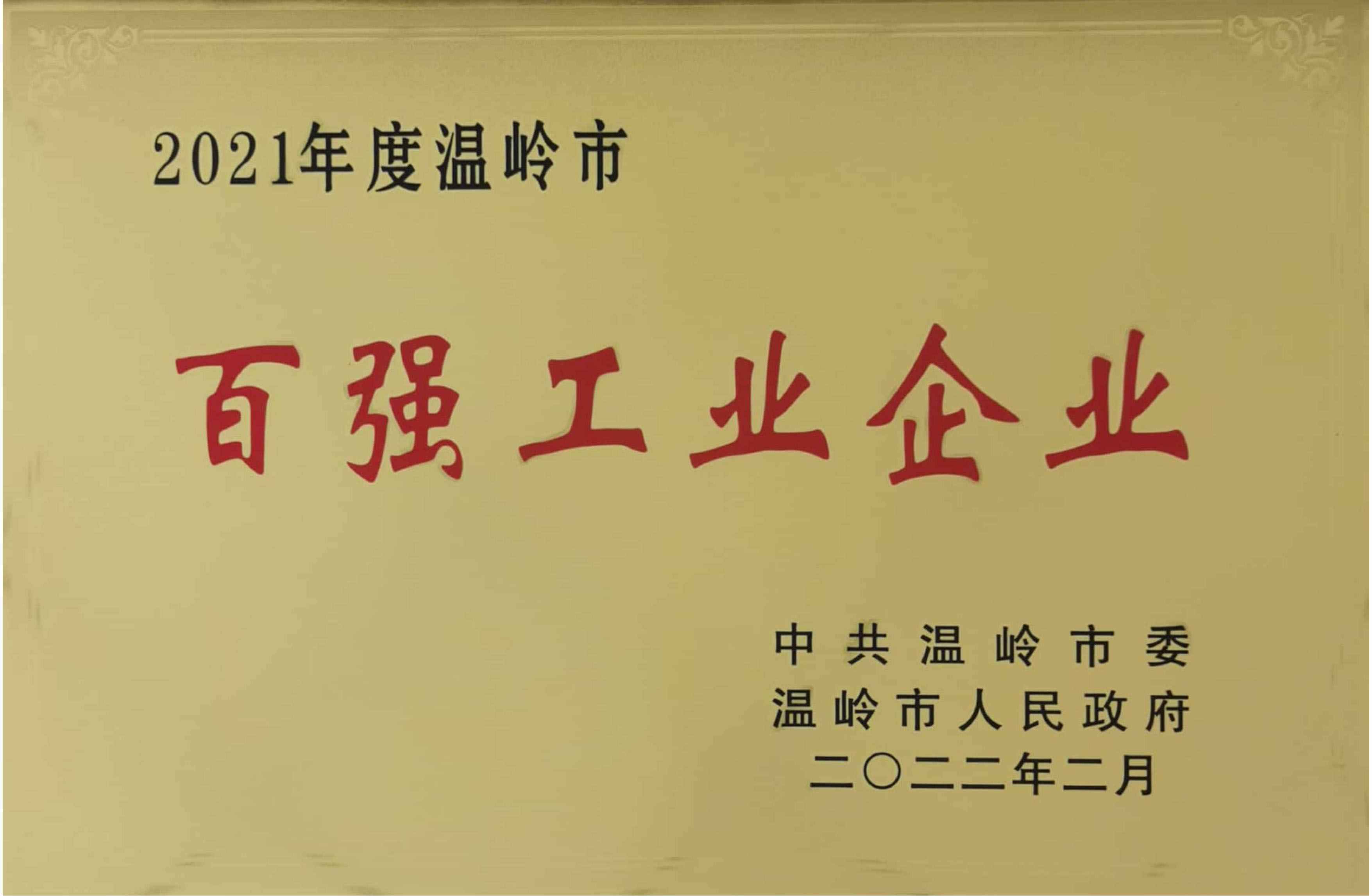 2021年度我公司再次荣登温岭市“百强工业企业”榜